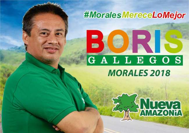 A medida que se acerca la fecha de los comicios de estas elecciones regionales y municipales, ya se van perfilando con más nitidez las tendencias hacia donde se orientan los votos, para el caso del distrito de Morales el movimiento Nueva Amazonía lleva como candidato a la alcaldía a Boris Gallegos Mendoza, está ganando posiciones a través de un nuevo estilo de hacer política, pues está presentando a la población moralina propuestas viables orientado principalmente a dos temas principales como son el ordenamiento territorial y urbanístico, y solucionar el problema del agua y el saneamiento a nivel integral.