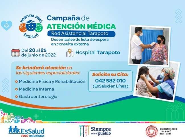 Cabe indicar que, en mayo se realizó una primera campaña en la especialidad de gastroenterología y medicina física y rehabilitación. Añadió que se continuará realizando coordinaciones para que este tipo de actividades asistenciales se desarrollen con más frecuencia en los establecimientos de la Red Asistencial Tarapoto en beneficio de todos los asegurados.