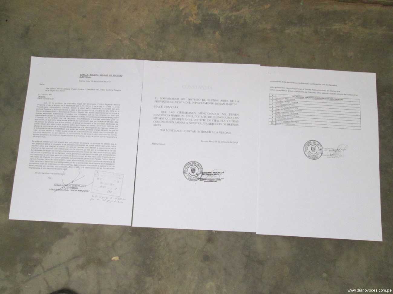 Garate Arce, en el mismo documento sustenta, que diez electores descrita en la una foja por orden regular, fueron detectados inmediatamente al termino de las elecciones, que a la misma el gobernador distrital, Lerner Paredes Tello, certificó a través de una constancia, que obligo iniciar la demanda, amparado en el art. 10 Inc. 3 de ley 27444 Ley de procedimiento administrativo general, en contra del supuesto ganador de la agrupación política Alianza Para el Progreso, a quien responsabilizamos de la presencia de estos golondrinos traídos de la localidad de Chazuta, lugar de nacimiento y vivencia del supuesto ganador.