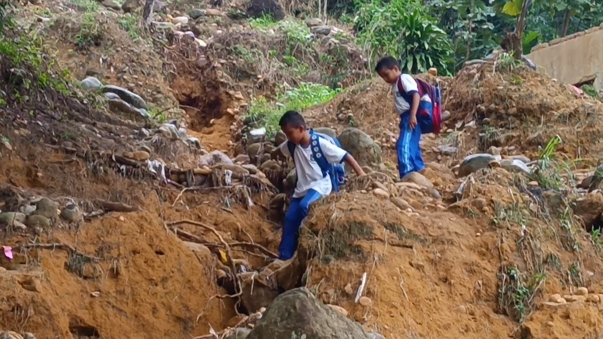 Las imágenes captadas muestran el peligro evidente al que se enfrentan los transeúntes, como una madre de familia con un bebé en brazos que casi sufre una caída debido a la erosión causada por las lluvias.