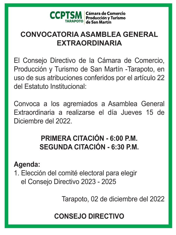 Camara de Comercio Producción y Turismo de San Martin: Convocatoria Asamblea General Extraordinaria