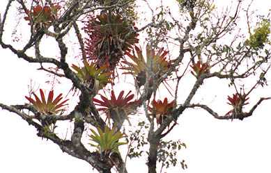 Iniciamos nuestra ruta a través del bosque sobre los 2600 metros sobre el nivel del mar. El clima es perfecto, como si en el ambiente existiese un aire acondicionado incorporado que hace posiblle una caminata sumamente agradable, a pesar de subir una cuesta, que no genera ningún inconveniente. Los árboles se encuentran cargados de bromelias, bellas plantas, familiares de las piñas que lo adornan todo con su coloración.