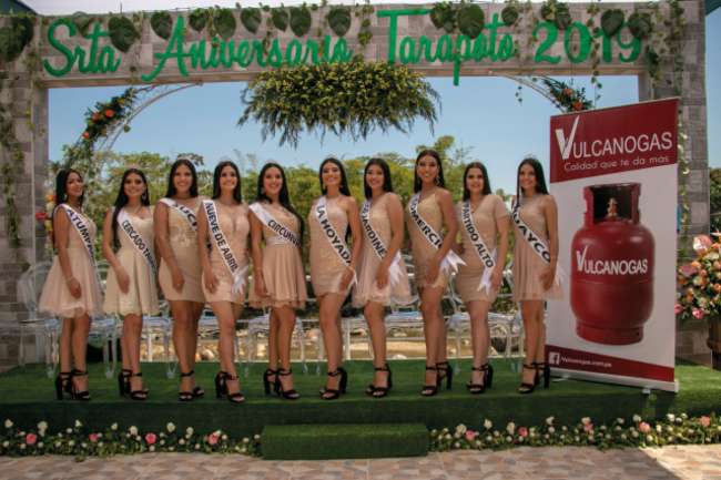 Diez agraciadas jovencitas participan en el evento de Elección y Coronación Señorita Aniversario Tarapoto 2019, y representan a los diversos barrios y sectores de la ciudad.