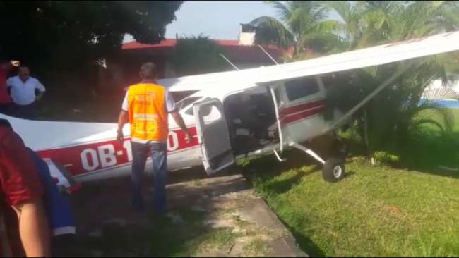 El incidente ocurrió al promediar las 8.30 am de ayer, en circunstancias que la avioneta de matrícula OB 1790 de la empresa SARU, aterrizó en el aeropuerto Moisés Benzaquen, y el freno no funcionó correctamente, viéndose obligado el piloto de hacer una maniobra dirigiendo el vehículo hacia la zona de estacionamiento de aeronaves, logrando detener su marcha, tras impactar contra unas plantaciones.