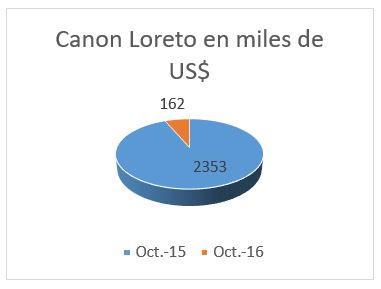 A través de una nota de prensa, la Sociedad Peruana de Hidrocarburos (SPH) informa que a raíz de la crisis en la producción de petróleo, el canon y sobrecanon con el que se beneficia la región Loreto viene cerrando el año con una caída de 76%, al pasar de US$ 33 millones 566 mil en los primeros diez meses del 2015 a US$ 8 millones 74 mil hasta octubre del 2016 (ver cuadro 1).