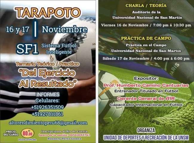 Seminario de Capacitación, dirigido a Entrenadores de Fútbol, Preparadores Físicos, Preparadoresde Arqueros y Aficionados. Días 16 y 17 de noviembre en la UNSM de Tarapoto. Vacantes limitadas, se otorgará Certificados. Exponente Profesor Humberto Jesús Camino Cantuarias Entrenador Titulado en Fútbol – Gerente General de A1R – Capacitador Internacional en Fútbol.