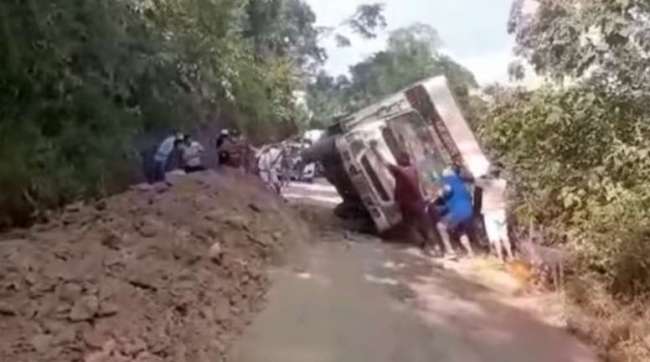 La tarde de ayer lunes, un camión volquete que transitaba en la carretera Puerto López – Sauce, quedo en posición inversa (volteado) luego de impactar en un montículo de material ubicado al costado de la carretera, material que se viene utilizando en el mantenimiento de la vía, el accidente generó que el vehículo averiado quedo ocupando el ancho de la carretera e imposibilitando el tránsito.