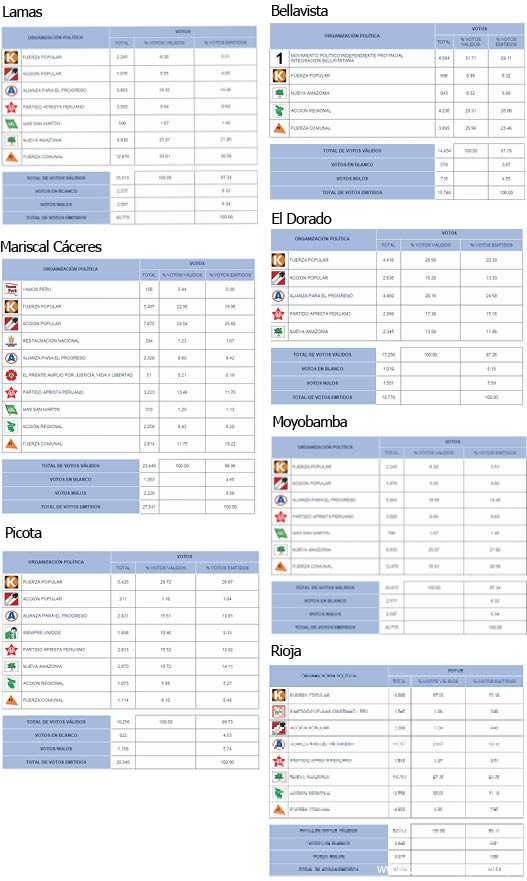 En Lamas, ganó Fernando del Castillo Tang de Fuerza Comunal; en Mariscal Cáceres ganó José Pérez Silva de Acción Popular, en Picota ganó Rolando García de Fuerza Popular; en Bellavista ganó Benjamín Hammerlin Vásquez del movimiento Integración Bellavistana; en El Dorado ganó Francisco Huamán Febre de Alianza Para el Progreso; en Moyobamba ganó Oswaldo Jiménez de Nueva Amazonía y en Rioja se reeligió Mercedes Torres Sánchez de Nueva Amazonía.