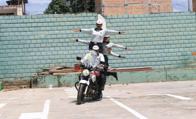 INTEGRANTES DE LA POLICÍA DE TRÁNSITO PRACTICANDO ACROBACIAS DE LA JEFATURA DE TARAPOTO durante una clausura de un curso policial en 105, hace unos meses