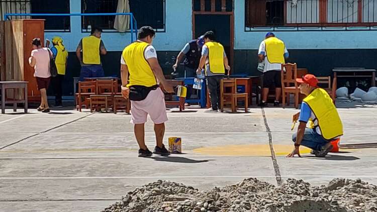 Exreclusos y sentenciados a prestación de servicio a la comunidad pintaron paredes de colegio en el barrio Huayco de Tarapoto. 30 personas, entre exreclusos y