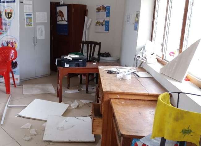 En el nivel primario Rompiendo puertas y ventanas, delincuentes irrumpieron la Institución Educativa Jiménez Pimentel del nivel inicial, logrando sustraer computadoras, artefactos, sillas y otros