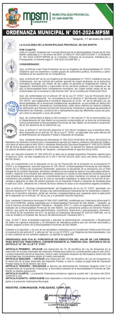 Actualidad Municipalidad Provincial de San Martin: Ordenanza Municipal N° 001-2024-MPSM 19 01/01/2024