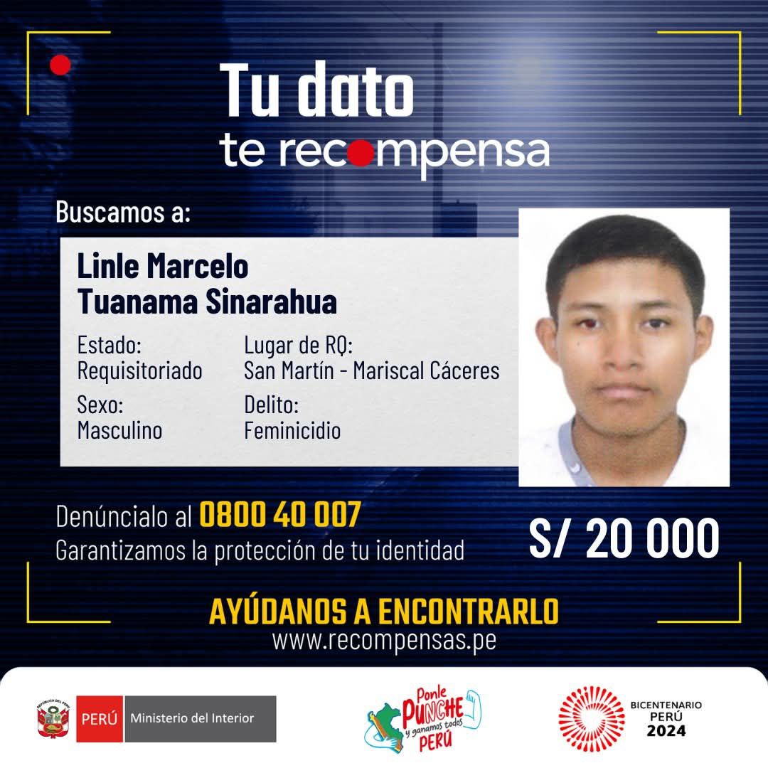 El Ministerio del Interior desde ayer viene ofrecido una recompensa de 20 mil soles para quien brinde información que permita ubicar a Linle Marcelo Tuanama