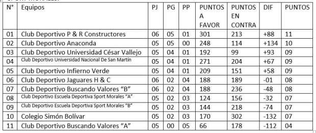 Hasta la fecha, el quinteto del Club Deportivo P&R Constructores viene liderando el campeonato con 11 puntos tras jugar 6 partidos, 5 partidos ganados y un partido perdido, además tiene 301 puntos a su favor y 213 puntos en contra con una diferencia de +88 puntos.