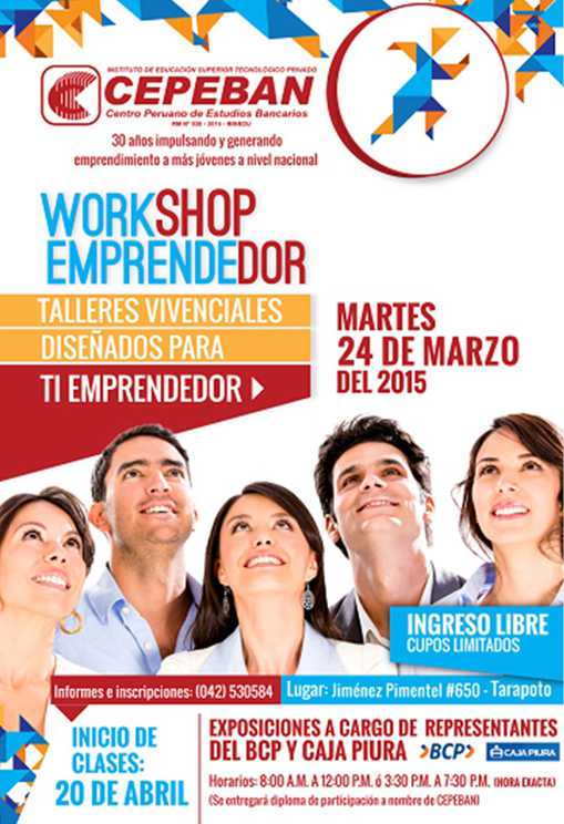 El Centro Peruano de Estudios Bancarios CEPEBAN en Tarapoto, presentará un innovador WORKSHOP – TALLER VIVENCIAL para emprendedores el 24 de marzo en dos horarios: 8:00 a.m. y 3:30 p.m. en su auditorio del Jr. Jiménez Pimentel 650 Tarapoto.