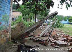 Luego de las precipitaciones pluviales registradas el sábado 25 de octubre en la región dejó como consecuencia la caída de una parte del cerco perimétrico de la Institución Educativa Cleofé Arévalo del águila (CADELA) del distrito de la Banda de Shilcayo según los vecinos del sector el agua que baja con fuerza del sector alto donde se ubican las asociaciones de vivienda hizo que la pared cediera y se desplome ante la mirada atónita de los directivos del plantel quienes presagiaban que en cualquier momento iba a ocurrir una desgracia sin embargo rápidamente se comunicaron con los representantes de defensa civil de la municipalida distrital que de inmediato realizaron la evaluación de los daños.