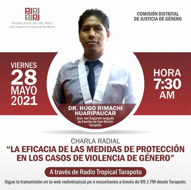La orientación sobre estas medidas de protección en casos de violencia de género estará a cargo del magistrado Hugo Rimachi Huaripaucar, Juez del Segundo Juzgado de Familia de la provincia de San Martín-Tarapoto, a las 07:30 a.m., en Radio Tropical Tarapoto, el día viernes 28 de mayo del presente año.