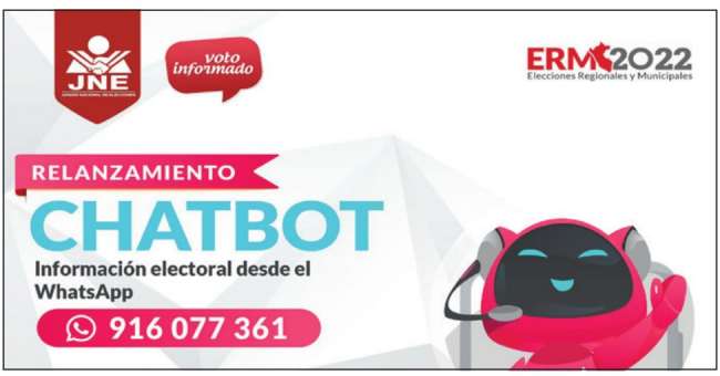 El presidente del Jurado Nacional de Elecciones (JNE), Jorge Luis Salas Arenas, afirmó que el asistente virtual o chatbot, que presentó el organismo electoral, permitirá interactuar con millones de electores para lograr un voto más sólido, informado y responsable en las próximas Elecciones Regionales y Municipales 2022 (ERM).
