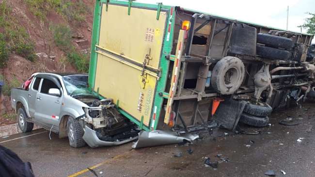 Según los pasajeros de otras unidades, ambos vehículos se desplazaban a velocidad, es por ello que no tuvieron tiempo para evitar que el camión se voltee y aplaste la camioneta, cuyo accidente pudo traer consecuencias fatales.