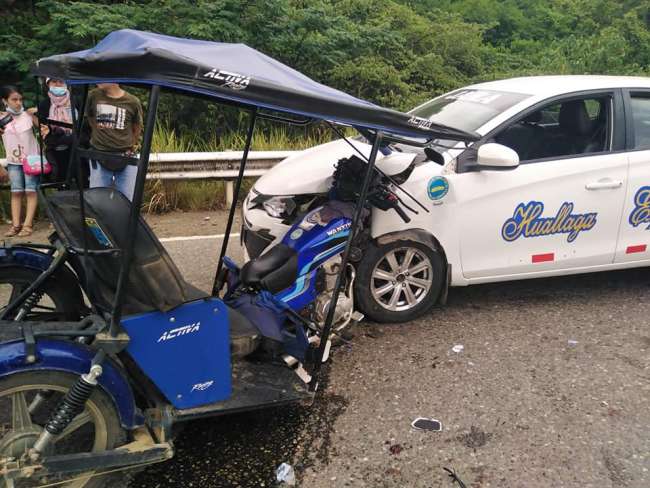 El choque de un trimóvil y un vehículo de servicio público dejó ayer por la mañana tres personas heridas, quienes de inmediato fueron auxiliadas y conducidas al Hospital II – 2 de Tarapoto. El hecho se produjo en la carretera Fernando Belaúnde Terry, sector El Abra. Hasta el momento se desconoce la causa del accidente de tránsito y cual de los dos conductores tiene mayor responsabilidad.