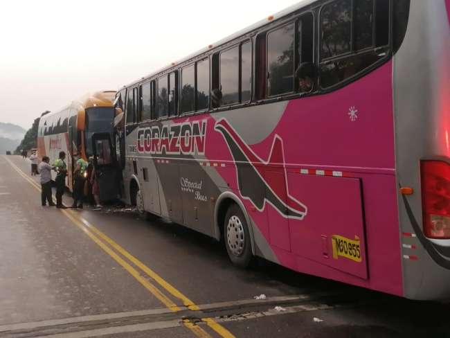 El choque frontal de dos ómnibus de transporte público en la carretera Fernando Belaúnde Terry, en la provincia de Rioja, dejó como saldo nueve pasajeros heridos que fueron auxiliados por agentes de la Policía de Carreteras de la localidad de Aguas Claras. Las investigaciones del accidente están a cargo de personal de la Comisaría de Naranjos, en el distrito de Pardo Miguel.
