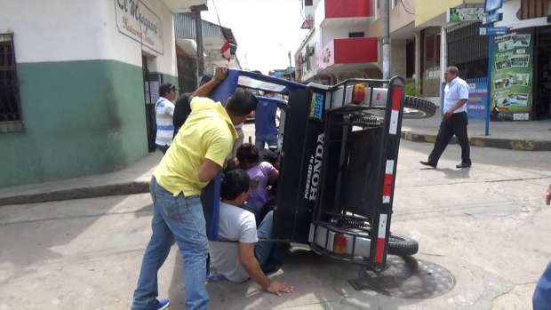 Tarapoto. Una familia fue auxiliada ayer al mediodía tras ser víctima de un accidente de tránsito en pleno centro de la ciudad, en momentos que un trimóvil fue impactado por una motocicleta cuando cruzaba la intersección de los jirones Manco Cápac y Moyabamba, un joven resultó herido por proteger a su hija que de milagro salió ilesa.