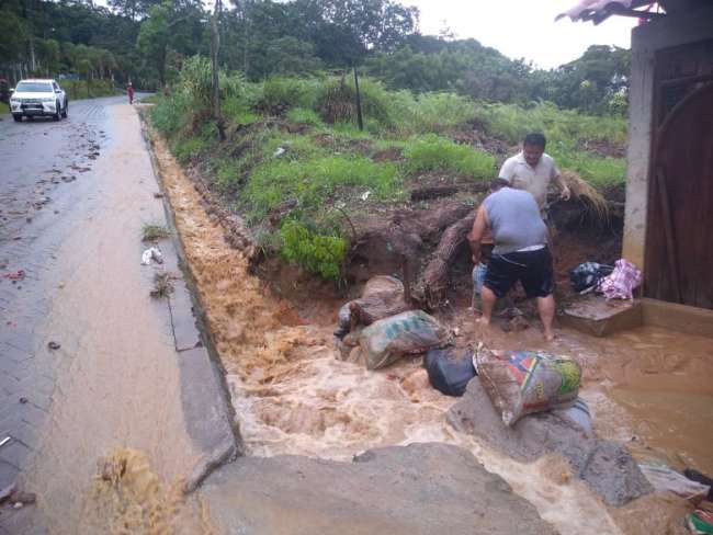 Lluvias inundan vivienda de la familia PinEdo, ubicada al frente del Proyecto Huallaga, gestión anteior de Walter Grundel tuvo la genial idea de cerrar cuneta para que no entre agua de lluvia a institución, pero no miraron a los vecinos del frente