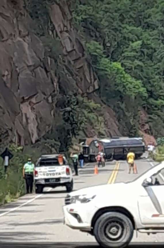 Este viernes, una cisterna se despisto en la carretera Fernando Belaunde Terry sector «El Abra Machungo», vehículos y pasajeros estuvieron varados durante horas provocando un congestionamiento en el tráfico.