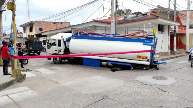 La llanta posterior izquierdo del pesado vehículo se hundió a las 11:15 horas, ocasionando daños al vehículo que permaneció cerca de cuatro horas en el lugar, ya que no fue nada fácil que lo saquen debido al peso de la cisterna que tuvo que regar en la calle más de dos mil litros de agua que transportaba.
