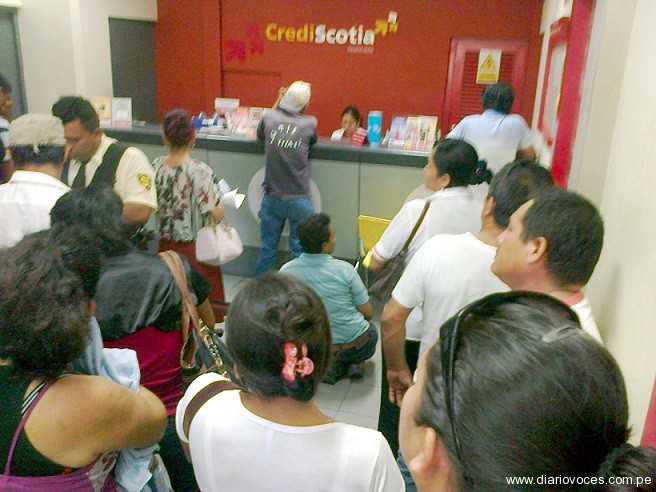 Un grupo de personas mostró su malestar, por la falta de personal en las ventanillas del CrediScotia, donde los clientes tienen que esperar casi dos horas en ser atendidos, en la oficina que se encuentra ubicada al costado del Banco Continental, la hora en que se nota la falta de personal es en las tardes, incluso no hay área para la atención de ancianos y discapacitados.