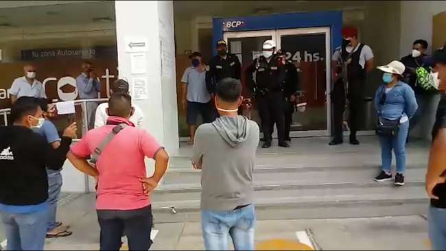 En los exteriores del Banco BCP, ayer a las dos de la tarde la gente comenzó a protestar, muchos de ellos manifestaron que desde la mañana no eran atendidos ya que solo se habría habilitado una ventanilla para el pago; “esto es un maltrato y exposición de nuestra salud” dijeron. En el Scotiabank también hubo inconvenientes, porque después de mucho tiempo esta semana comenzó la atención, luego que varios trabajadores dieron positivos al COVID – 19.