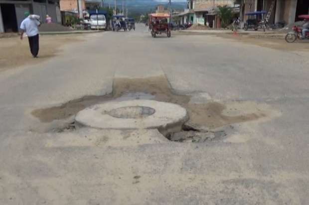 Tarapoto. Una alcantarilla de la urbanización Nueve de Abril se encuentra colapsada desde la última torrencial lluvia que se registró en Tarapoto, el hecho viene generando un riesgo inminente para los conductores de vehículos, ya que la parte afectada no está señalizada para advertir el peligro.