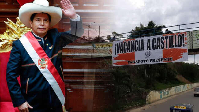 Integrantes del colectivo, ciudadanos por la democracia, colocaron este jueves una banderola en el puente peatonal cerca de Boulevard Santa Rosa en el distrito de Morales, exigiendo vacancia del presidente Pedro Castillo.
