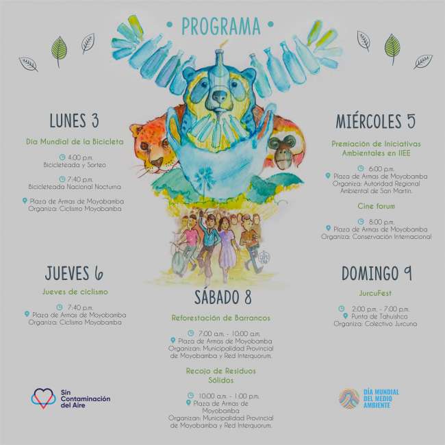 El programa inicia este lunes 3 de junio con el Día Mundial de la Bicicleta con dos bicicleteadas y el sorteo de una bicicleta entre los asistentes; el miércoles 5 de junio, la Autoridad Regional Ambiental premiará a las mejores iniciativas ambientales de las Instituciones Educativas de Moyobamba, y por la noche Conservación Internacional realizará una proyección documental en la Plaza de Armas de esta ciudad capital.