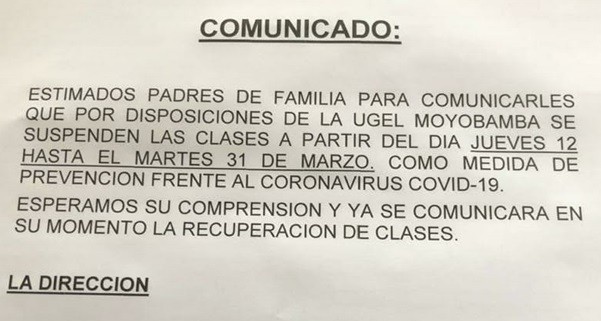 Moyobamba. Luego que el Presidente de la República, anunciara suspender el inicio de clases en los colegios públicos y privados hasta el lunes 30 de marzo, las instituciones educativas privadas de Moyobamba que venían funcionando desde el pasado lunes 09, determinaron acatar la medida.