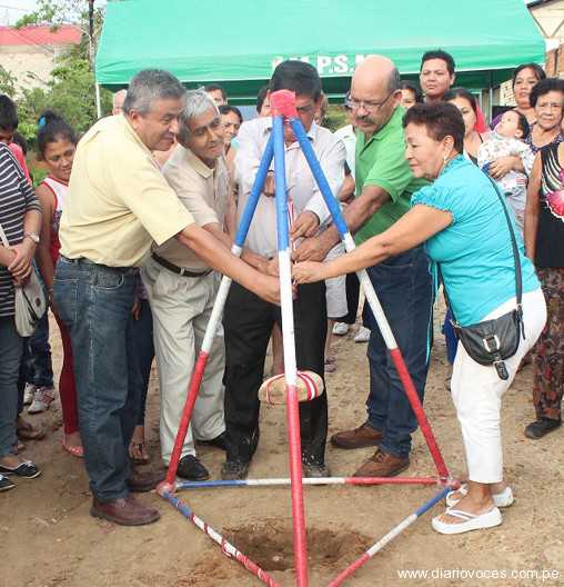 Dando inicio a la Obra de Mejoramiento de las Redes y Conexiones domiciliarias de agua potable y alcantarillado sanitario del Jr. Ramón Castilla cuadras del 01 al 07 en la Urbanización 09 de Abril en el Distrito de Tarapoto, Provincia de San Martín, el Alcalde Encargado Lic. Reynaldo Orellana Vela, los Dirigentes y la población del referido Jirón colocaron la primera piedra en medio de gran algarabía.