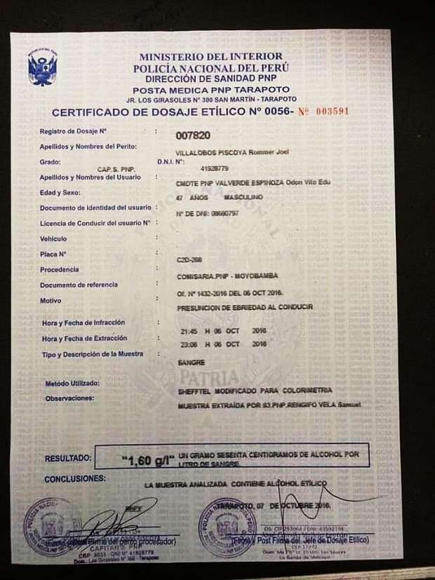 El coronel PNP Mayo Alejandro Ardiles Carlos, Director de la Región Policial San Martín, manifestó que luego de conocer el resultado del dosaje etílico que arrojó un gramo sesenta centígrados de alcohol por litro en la sangre (“1.60 g/l”), firmado por el suboficial Rommer Villalobos Piscoya, responsable de la prueba practicada a Valverde Espinoza.