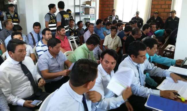 La audiencia se viene realizando en la sede judicial que está ubicado en la cuadra uno del jirón Santa Rosa Santa Rosa del barrio Partido Alto de Tarapoto, el primer grupo de detenidos que respondió las imputaciones de los representantes del Ministerio Público fueron Segundo José Quispe Pérez, Jhank Marcos García Paisig, Luis Abel García García, Alan Camacho Linares., Noe Francisco Huamán Bravo, Luis Fernando Ramos García y Stalin Eliot Quispe Cisneros.