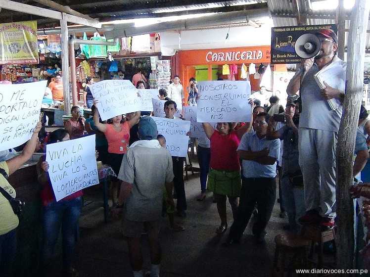 Un grupo de comerciantes del mercado Dos de Tarapoto protestó ayer por la mañana, en rechazo al falló del juez Félix Ramírez, sobre la prescripción adquisitiva de ese centro de abasto, a favor de la Municipalidad Provincial de San Martín, los vendedores junto a su asesor legal determinaron apelar el caso.