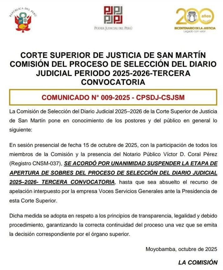 La Comisión de Selección del Diario Judicial 2025–2026 de la Corte Superior de Justicia de San Martín decidió suspender la etapa de apertura de sobres del proceso de selección hasta que se resuelva el recurso de apelación interpuesto por la empresa Voces Servicios Generales de comunicaciones EIRL, según lo indica el Comunicado N.º 009-2025-CPSDJ-CSJSM, emitido el 15 de octubre.