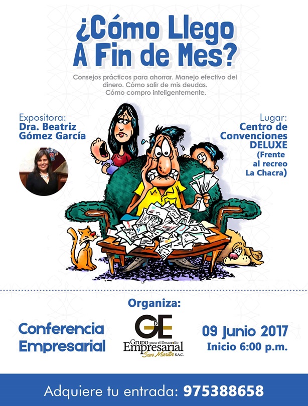 El Grupo Para El Desarrollo Empresarial, como iniciativa a la mejora del manejo de dinero de los sanmartinenses, realizará la conferencia “¿Cómo llego a fin de mes?”. Un evento que tiene como finalidad, dar soluciones a los problemas económicos que nos aquejan por falta de planificación. La cita se dará el próximo viernes 09 de junio, a la 6:30 pm en el Centro de Convenciones DELUXE.