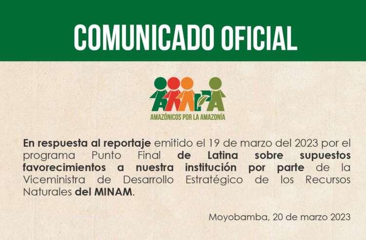 En respuesta al reportaje emitido el 19 de marzo del 2023 por el programa Punto Final de Latina sobre supuestos favorecimientos a nuestra institución por parte de la Viceministra de Desarrollo Estratégico de los Recursos Naturales del Ministerio del Ambiente – MINAM.