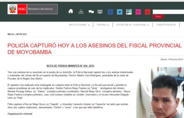 Desde el Ministerio de Interior (MININTER) ayer se emitió una nota de prensa donde titulan al suceso como la captura de los asesinos, luego de conocer que los presuntos implicados habían sido identificados en Moyobamba.