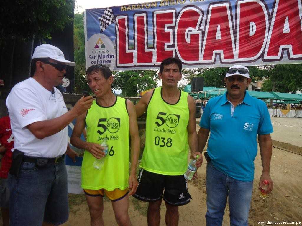 Con la participación de cerca de un centenar de deportistas, ayer domingo se desarrolló la I Maratón “Atilio Vásquez Gómez” organizado por la Cooperativa de Ahorro y Crédito San Martín de Porres celebrando de esta manera sus bodas de oro, evento que concitó la atención de los amantes del atletismo quienes previa inscripción, evaluación médica e implementación partieron desde la Plaza Mayo de Tarapoto cumpliendo con un recorrido de aproximadamente 24 Km. Hasta el distrito de Cacatachi y que tuvo como punto de llegada la Concha Acústica donde familiares y amigos esperaron a los ganadores en medio de aplausos y mucha emoción. Luego de dos horas de duro trajín, los organizadores de este importante evento deportivo procedieron a la ceremonia de premiación a los tres primeros puestos de cada categoría quienes se llevaron los siguientes premios:
