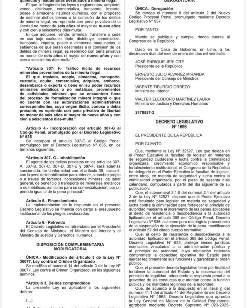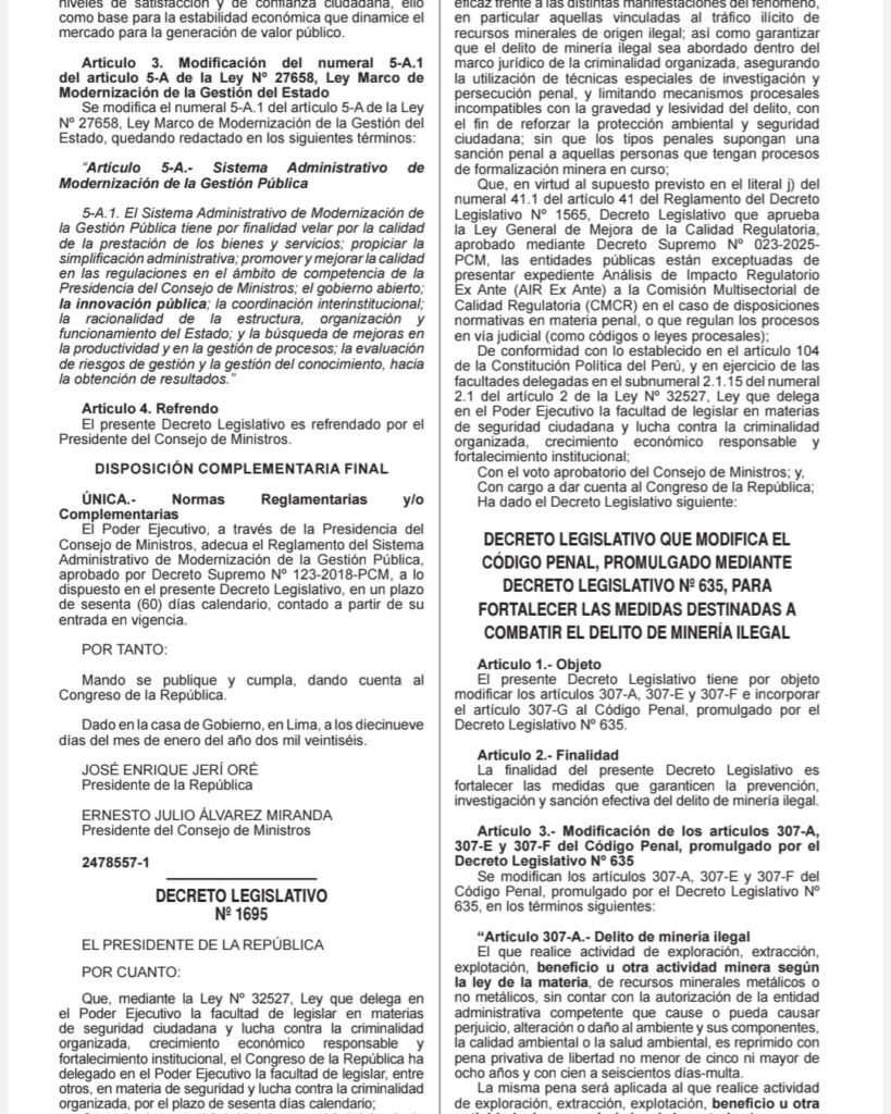Ayer, en el Diario Oficial El Peruano, se publicó el Decreto Legislativo N.° 1695, norma que modifica el Código Penal con el objetivo de fortalecer las medidas destinadas a combatir el delito de minería ilegal en el país.