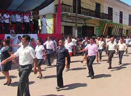 Los docentes participaron primero en el desfile cívico militar en la Plaza Mayor de Yurimaguas, tras el izamiento del Pabellón Naconal y de las Banderas que representan a la provincia de Alto Amazonas y a la región Loreto.