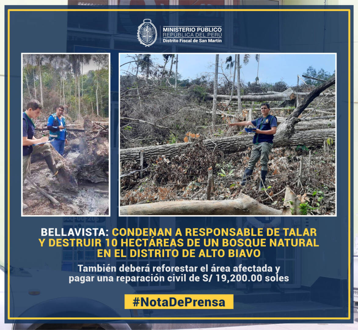 En audiencia de juicio oral, el fiscal adjunto provincial John Nilton Ernesto Ventura Castillo acreditó que, entre los años 2019 al 2022, el sentenciado Linder Mozombite Isuiza, taló y destruyó diez hectáreas de un bosque natural ubicado en el sector de Mojarras, caserío Palmas, distrito de Alto Biavo, provincia de Bellavista. Ello, sin contar con autorización de la Autoridad Regional Ambiental.
