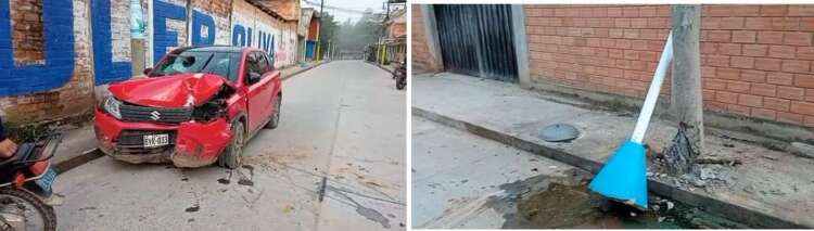 Ocurrió esta mañana en el jirón Pedro Pascasio Noriega, cuadra 10 del barrio de Zaragoza, cuando el conductor de un auto de color rojo en aparente estado de ebriedad impacta contra el poste de luz, que quedó seriamente averiado, por lo que los vecinos piden que se cambie el poste que también sirve como alumbrado público.