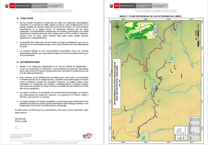 El informe detalla que no fue posible confirmar la totalidad de las evidencias arqueológicas reportadas en 2008, debido a cambios en el paisaje y afectaciones provocadas por la erosión. Sin embargo, se constató la probable existencia de una antigua ruta prehispánica que todavía es utilizada por comunidades locales como camino rural entre Moyobamba y Lamas.