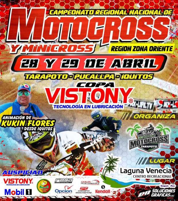 Amigos de Tarapoto este 28 y 29 de abril gracias a la Asociación Deportiva Motocross Tarapoto y el auspicio de Promotora Opción se llevará a cabo el Campeonato Regional Nacional de Motocross y Minicross con los mejores pilotos de Tarapoto, Pucallpa e Iquitos. Un evento que no se podrán perder, con las categorías o clases, en: 50 cc. (4 y 6 años). 50 cc. (6 y 8 años), 66 cc. 85 cc., de 10 a 12 años., WMX, -MX Open., Mecánica Nacional-VMX., -85 cc., (12 a 15 años). MX2 y MX1, respectivamente.